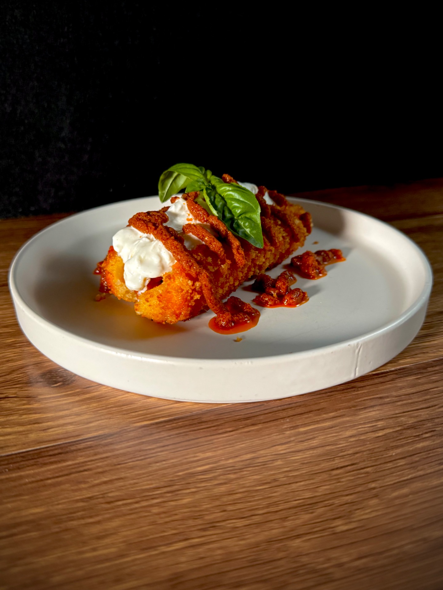 Crocchetta artigianale realizzata con patate locali, farcita con melanzane a funghetto, cuor di burrata vaccina Molisana, pesto di pomodi secchi.